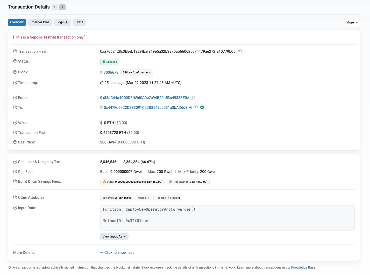 6. On the Transaction Details page, click Logs to display the list of transaction events. Notice the OperatorCreated and AuthorizedForwarderCreated events.