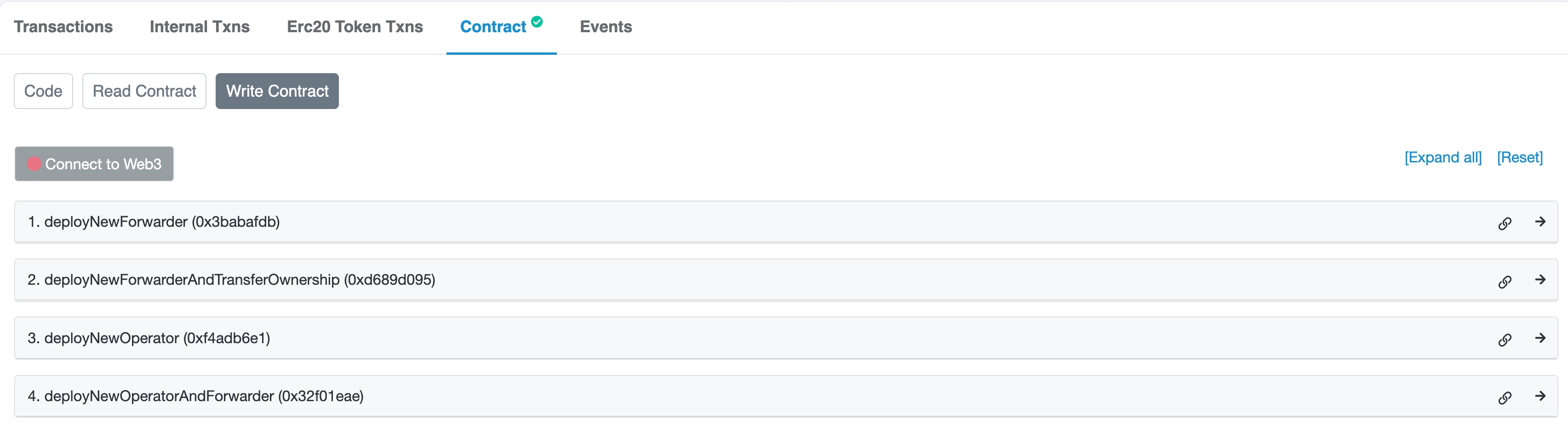 2. Click the Contract tab. Then, click Write Contract to display the write transactions on the factory.