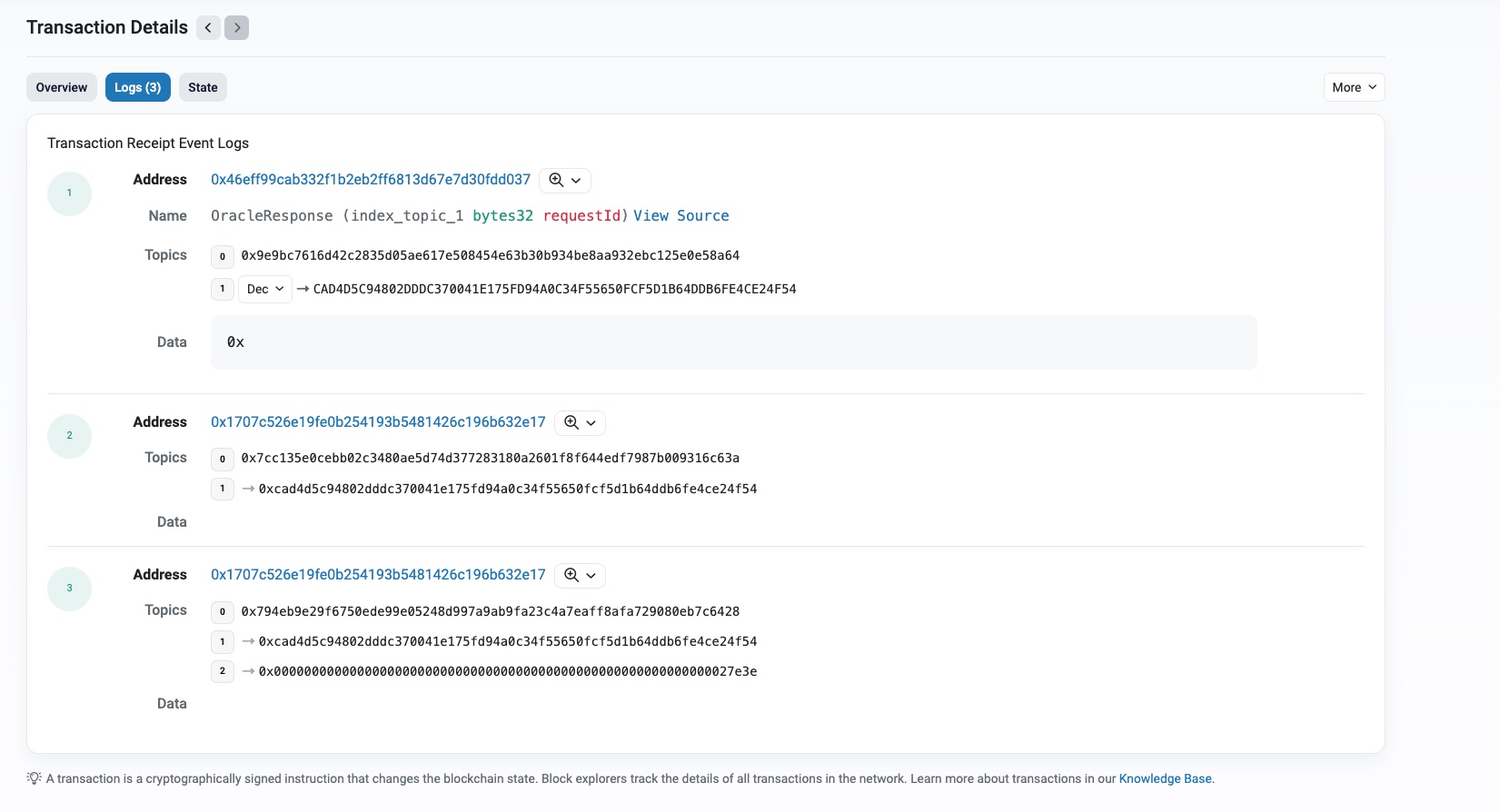 Then click on the Logs tab to display the list of events. Notice the OracleResponse events. The operator contract emitted them when the Forward contract called it