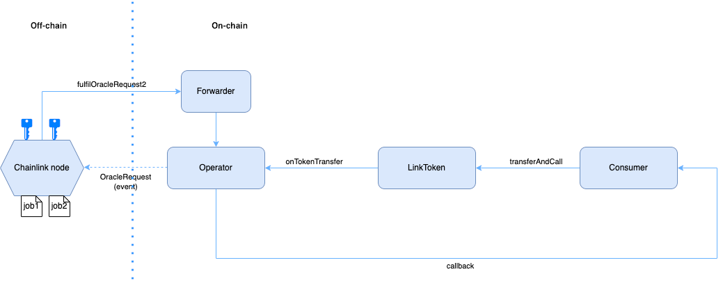 • Allow the two Chainlink node EOAs to call the forwarder's forward function. Because the operator contract owns the forwarder contract, call acceptAuthorizedReceivers on the operator contract. Specify the forwarder contract address and the two Chainlink node EOAs as parameters. This call makes the operator contract accept ownership of the forwarder contract and authorizes the Chainlink node EOAs to call the forwarder contract by calling setauthorizedsenders.