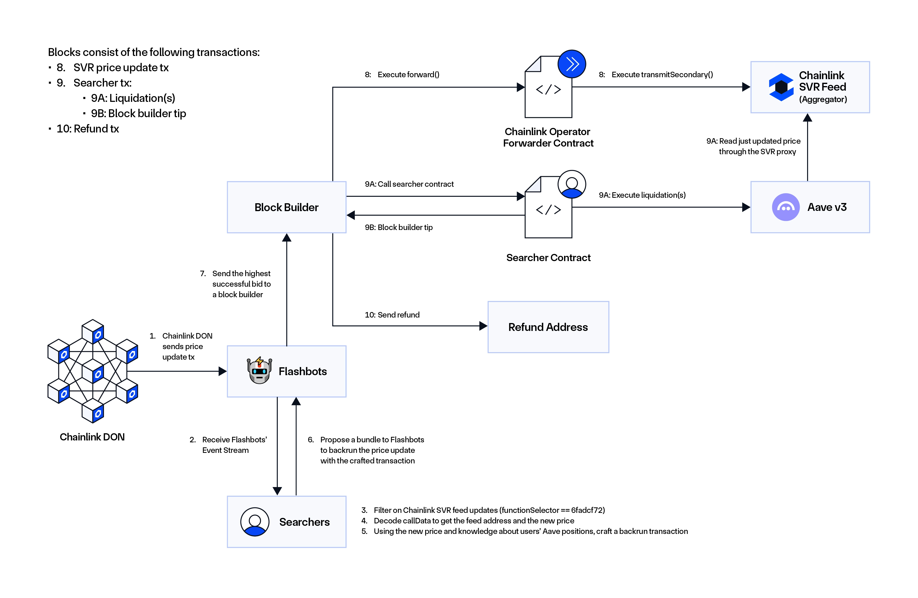 This guide explains how to identify and bid on Chainlink SVR liquidation opportunities through Flashbots MEV-Share. SVR Feeds support a private transmission channel for oracle price updates, enabling searchers to backrun new prices with liquidation transactions and compete for profit.